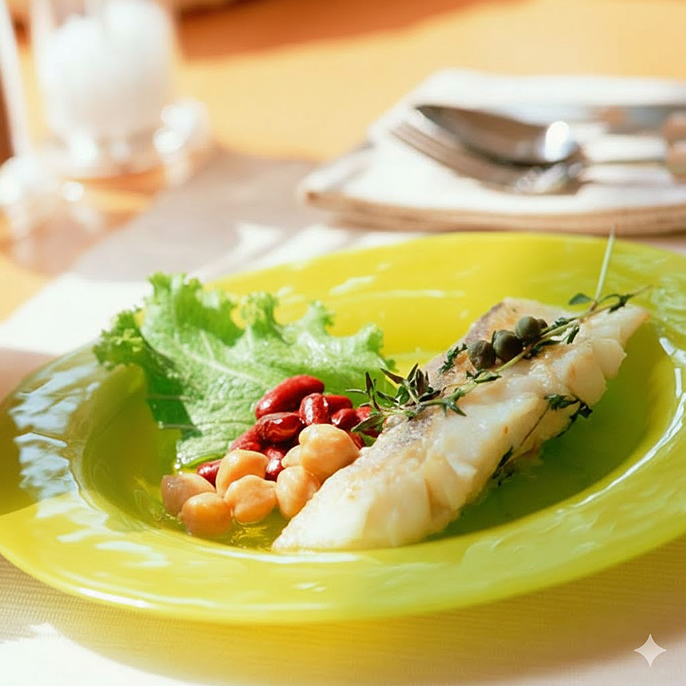 白身魚のポアレとミックスビーンズ